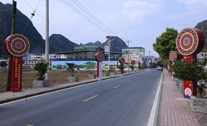 穿村而过的乡间公路,两排具有壮族文化特色的铜鼓、村屯标识牌和文化宣传栏,沿街的居民楼房墙面,一幅幅彩绘通俗易懂、生动有趣……壮乡儿女以丹青笔墨,深情、艺术地描绘了“红色故里”在谱写中国式现代化广西篇章中所取得的新变化新成就。